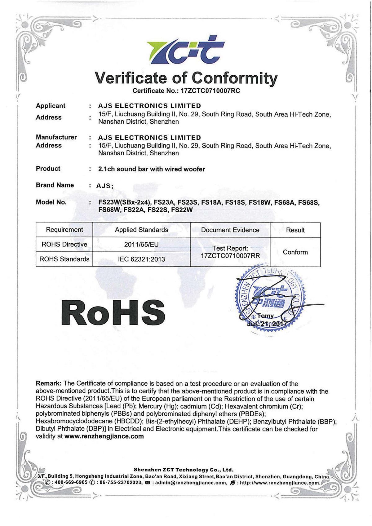 Standard:RoHS Number:17ZCTC0710007RR Issue Date:JUL.21,2017 Scope/Range:Sound Bar Issued By:Shenzhen Test